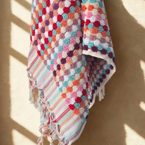 Inspired by the softer, subtle colours of the Australian bush. Luxurious multicoloured pompom towels in soft pastel tones of green, blue, grey + white. These towels are made the old fashioned, slow way in Turkey.