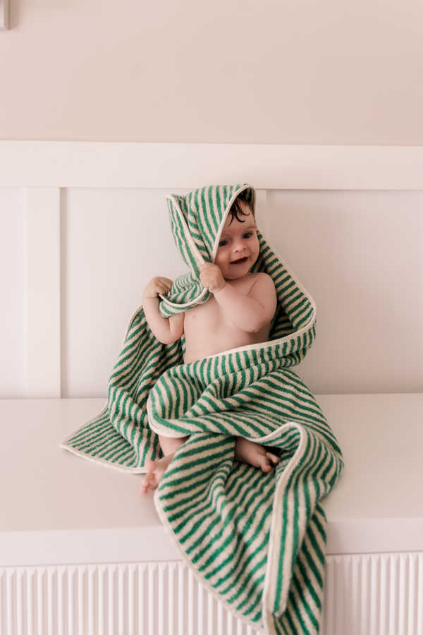 Indulge in our luxurious hooded baby towel made from 100% Turkish cotton and certified by Oeko-Tex®. With dimensions of 85cmH x 77cmW and weighing 445g, this towel is hand loomed in Turkey by small groups of artisans using traditional weaving methods. Rows of pompoms add a touch of elegance and the towel comes in three beautiful colorways. Not only are they extremely durable and eco-friendly, but their softness and absorbency increase with each wash.