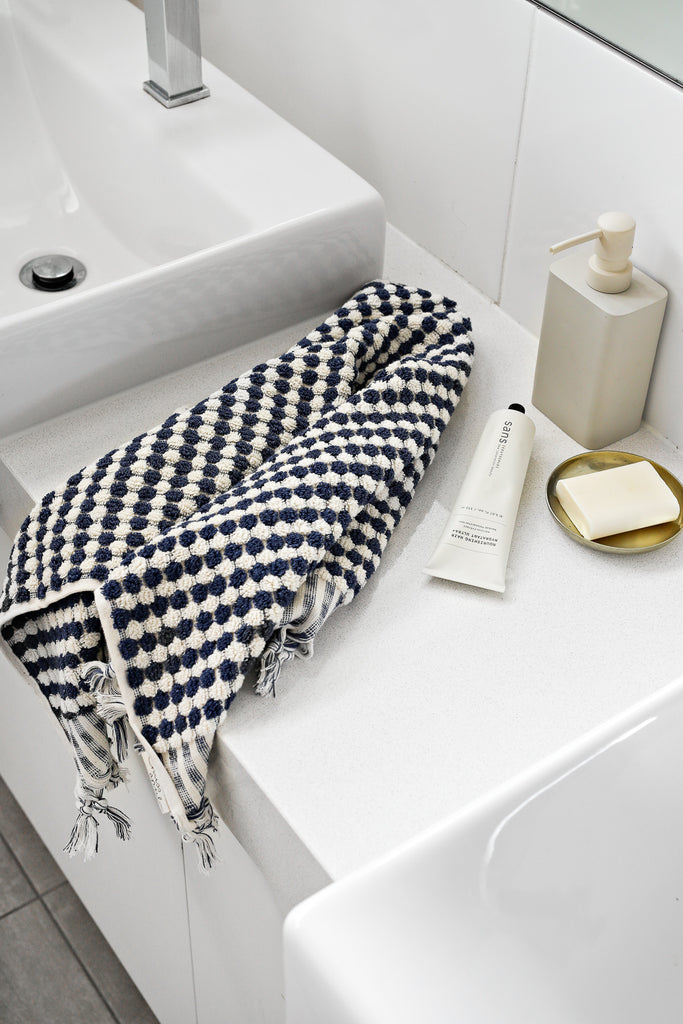 A luxurious handtowel in navy blue and white, made from rows of pom poms.