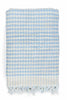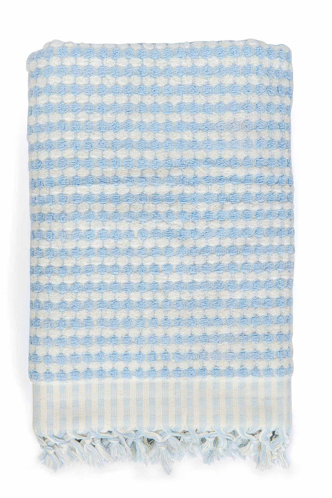 Luxurious pompom turkish towel in pale blue with hand twisted tassels/fringes - made the old fashioned, slow way in Turkey. Hand loomed using traditional weaving methods by small groups of artisans, with the tassels tied by hand by elderly women in the village.